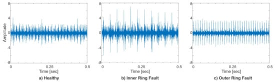 Time-domain plots of raw vibration signals for a healthy state, inner ring, and outer ring faults are presented in Figure 6. The visual inspection of the plots for preliminary dataset understanding shows that there are noticeable differences between the healthy, inner ring, and outer ring fault signals in time domain representation.