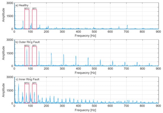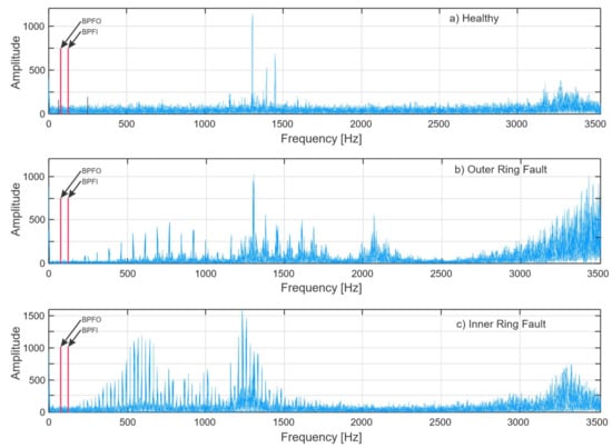 FFT is a common technique for converting the time domain contents of bearing vibration signal into the frequency domain for spectrum assessment. Figure 7 shows frequency spectra of bearing vibration signals under different health conditions obtained from FFT. For each bearing state, 10 random signals were chosen, and their spectra were plotted for representative comparative analysis of each bearing fault condition. The positions of fault frequency components in Table 3 that are obtained from Equations (3) and (4) are highlighted with red lines on all three bearing fault conditions. However, due to the high-frequency modulation by bearing natural resonance frequencies, BPFI and BPFO are not observable in the frequency spectrum.