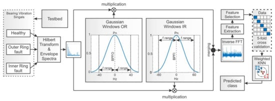 The overview of the proposed methodology is depicted in Figure 8. The whole process is essentially composed of five steps, each of which is described in its separate subsection. First, the Envelope spectra are obtained from raw vibration data by Hilbert Transform and Envelope Analysis. The placement of Gaussian windows along the squared envelope spectra is accomplished based on the computations involving bearing geometric parameters, mechanical parameters of the system, and the rotation speed of the shaft. After the multiplication with GMM-based windows, the obtained signal contains only the bearing fault-related frequency bands. Inverse FFT is performed with the signal to extract 17 features from the time domain. Another three features are extracted from the frequency domain. Then, the feature selection is performed. Selected features are provided to the Weighted KNN algorithm for classification.
