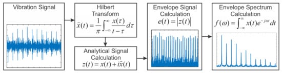 As shown in Figure 7, the raw vibration signal spectrum does not provide sufficient diagnostic information, because the bearing damage frequencies are amplitude-modulated to the high-frequency region, which results in the bearing fault frequencies observed in the spectrum using the conventional FFT method being visually indistinct. This predicament is resolved utilizing demodulation using envelope analysis which is a prominent signal processing method for bearing diagnostics [42,43]. The flowchart of the Envelope analysis is shown in Figure 9 [18].