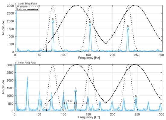 The second point is that the inner and outer ring fault frequency harmonics have different spectral shapes. The radial load influences the force of the impact caused by rolling over a defect; thus, since the outer ring is a stationary component, its defects are subject to the same force at each roll. However, the inner ring rotates at the speed of the shaft, and the defects on the inner ring are subject to varying force; therefore, each harmonic of bearing inner ring fault frequency is amplitude modulated by the rotating speed of the inner ring. This results in the sidebands around BPFI harmonics which are caused by the transitions of the inner ring defect into and out of the load area [44]. Figure 11 demonstrates this difference between the inner ring and outer ring fault envelope power spectra.