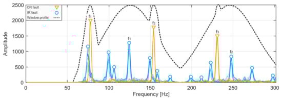 According to the methodology pipeline presented in Figure 8, the results of multiplication with OR and IR windows are merged to yield one signal, containing only the frequency bands that are useful for bearing fault diagnosis. The result of the merging process is presented in Figure 12 for Inner Ring and Outer Ring fault signals and must be considered as the result of the multiplication of signal envelope power spectrum and the set of OR and IR Gaussian windows, which are depicted by a broken line. After this multiplication is performed, the signal is obtained with isolated fault components, which is clearly seen in the signal envelope power spectrum. It is shown in Figure 12, where the blue peaks are the two harmonics of bearing Inner Ring fault signal with their sidebands. The orange trace is bearing the Outer Ring fault signal with three harmonics.