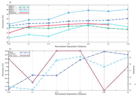 The difference in classification performance among the proposed method WPT-BE-MSVM and WPT-PCA-MSVM can be explained by the difference in feature selection. Feature selection in the proposed method described in Section 3.4 eliminates the features that do not cross the NSD value, thus leaving only the features with low scatteredness and high interclass separability. PCA, however, does not eliminate features, but instead constructs a lower-dimensional representation utilizing all the given features and does not consider the interclass separability, which in the current situation results in a slightly lower classification compared with the proposed method due to the low quality of the initial feature vector.