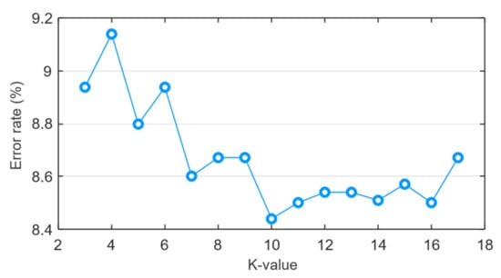In this work, a weighted KNN model was retrained for the number of neighbors (K-value) from three to 17 with a feature pool without feature selection. Then, the K-value was chosen based on which number of neighbors gave the least classification error rate for Weighted-KNN as is shown in Figure 15. Thus, the number of neighbors was chosen to be 10.