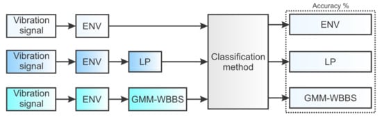 Performance comparison with state-of-the-art methods is performed according to the pipeline presented in Figure 16. Each comparison method is substituted into the “Classification method” block. The first method substituted in that block is a method that was used in this work as described in Section 3.3, Section 3.4 and Section 3.5. The second and the third methods are WPT-BE-MSVM and WPT-PCA-MSVM implemented in the same way as described in [48]. Each classification method is trained and tested with the three types of data, which are the same bearing vibration data processed by three types of signal processing techniques. For each method and type of processed data, five experiments were performed.
