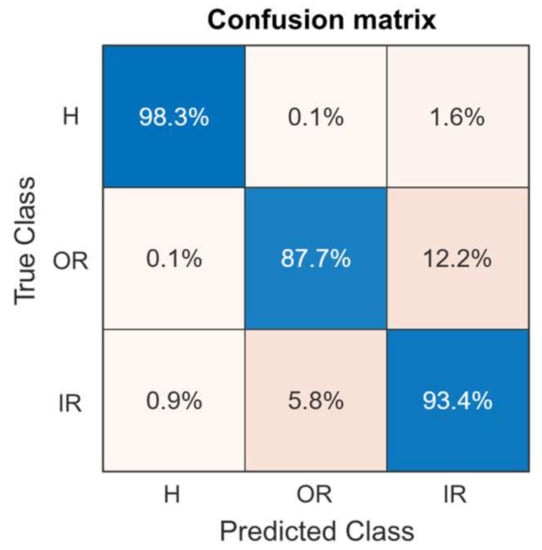 The confusion matrix for the GMM-WBBS method for all states data with Weighted KNN is provided in Figure 17. The confusion matrix shows the capability of the proposed method to classify healthy bearing, bearing with inner ring fault, and bearing with outer ring fault. The data used in this research contain only single bearing faults, so it is unknown how the proposed method will perform with mixed fault bearing data.