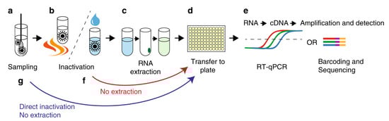 Steps for the reverse transcriptase PCR (RT-PCR) COVID-19 testing. (a) The sample is collected and put in a transport medium. (b) The virus is inactivated by detergents or by heating. (c) Viral RNA is extracted. (d,e) The contents are transferred to a 96 well plate for cDNA synthesis and detection by RT-qPCR or sample barcoding and high-throughput DNA sequencing. (f,g) In alternate method, the RNA extraction step can be omitted through direct inactivation of the virus by heating or direct lysis by detergents. The figure is reproduced and adapted under the Creative Commons license from Ioanna Smyrlaki et al., Nature Communications, Springer Nature (2020) [].