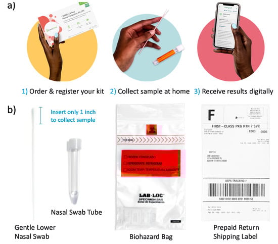 Everywell’s COVID-19 Test Home Collection Kit DTC (direct-to-consumer). (a) The procedure involves ordering the test kit, completing a health intake survey, registering the unique kit ID, self-collecting a nasal swab, shipping overnight to a CLIA-certified laboratory, and obtaining RT-PCR results within 24 to 48 h of the lab receiving the sample. A telehealth consult is available to follow up on the test results. (b) The Everywell test kit consists of a gentle lower nasal swab, nasal swab tube, biohazard bag, and prepaid shipping label. Images are reproduced and adapted with permission from Everywell [].