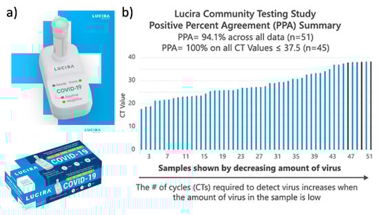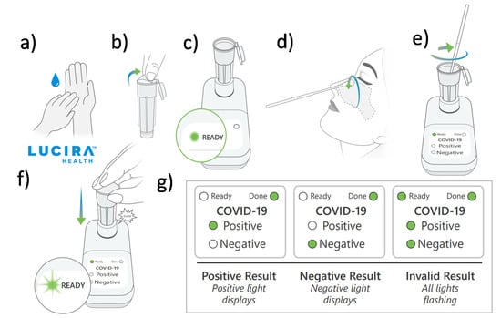 The Curative-Korva SARS-CoV-2 Assay is intended for prescription use where the respiratory specimen is collected by a trained healthcare provider []. The sample is put in Zymo DNA/RNA Shield and shipped to the KorvaLabs Inc. laboratory (San Dimas, CA) to perform the RT-PCR test []. Curative has set up over 10,000 COVID-19 testing and health service sites across the U.S. (e.g., drive-thru, kiosks, and mobile sites) and processes over one million tests every week at its three high-capacity labs []. The City of Riverside, for example, has collaborated with Curative Inc. to provide free oral fluid COVID-19 tests to all its residents, whether or not they are experiencing COVID-19 symptoms []. The Lucira COVID-19 All-In-One Test Kit is authorized for prescription home use with self-collected nasal swabs (in individuals aged 14 and older) and provider-collected nasal swabs (in individuals aged 13 and older) []. Instructions for using the Lucira test kit is shown in Figure 4. A community-based testing study found that the Lucira test had a 94.1% positive percent agreement (PPA) and a 98% negative percent agreement (NPA) with a FDA authorized SARS-CoV-2 test as depicted in Figure 5 [].