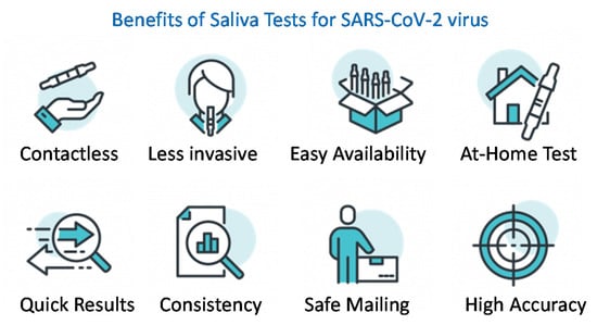 There are benefits of using saliva samples over nasal or throat swabs for the detection of SARS-CoV-2 (Figure 6) []. Saliva collection is contactless and poses a reduced risk to the healthcare worker. Saliva collection is less invasive than swab insertions and contributes to lower consumption of personal protective equipment (PPE) and nasal swabs. Saliva testing can be made easily accessible as at-home tests for patients at increased risks, sick patients, or patients in quarantine. However, the SARS-CoV-2 RNA in saliva specimens is only detectable during the acute phase of infection [,]. Positive test results from saliva specimens would suggest that SARS-CoV-2 RNA is present but may not rule out infections from bacteria or other viruses. Negative results from saliva specimens may not rule out SARS-CoV-2 infection and must be confirmed with alternate specimens and testing methods [].