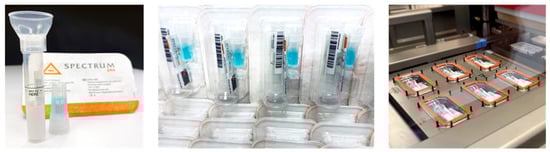 At-home saliva collection kits from Spectrum Solution and Infinity BiologiX (IBX) are often used for collecting, maintaining, and preserving saliva samples []. The Spectrum Solution’s SDNA-1000 Saliva Collection Device is intended to collect the saliva specimen in a plastic 6 mL tube with the aid of a funnel (Figure 7) []. Then, the stabilizing solution, housed in its fluid chamber, is mixed with the saliva specimen. The SDNA-1000 preservation agent inactivates the virus and renders the saliva specimen non-infectious, while preserving the stability of viral RNA for over 14 days at room temperature.