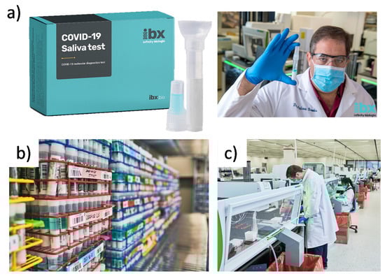 Demonstration of the manufacturing and testing facilities for laboratory processing, data storage, sample preservation, and analytical processes at IBX Infinity Biologix. (a) IBX Saliva Collection Kit. (b) A repository for cryo-preserving and storing a vast number of biological samples and consumables. (c) Automated instrumentation for sample purification, precision liquid handling, viral nucleic acid extraction and testing, Next Generation Sequencing, and analytical quality control. Images are reproduced and adapted with permission from IBX Infinity Biologix [].