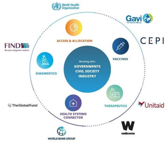 - WHO. Access to COVID-19 Tools (ACT) Accelerator. Available online: https://www.who.int/initiatives/act-accelerator (accessed on 5 May 2021).