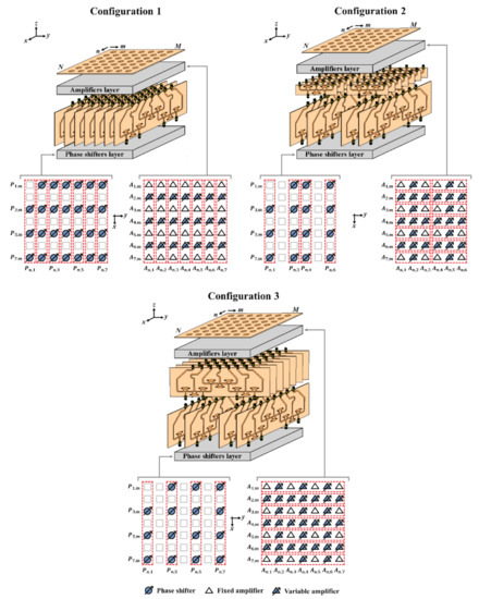 Configuration 2 proposes the interconnection of the outputs of seven blocks of 4 × 7 CORPS networks (parallel to the x-z plane) to the inputs of blocks of 2 × 3 CORPS network. This configuration uses 15 PSs and 26 variable amplifiers to control 42 antenna elements (7 × 6 array). This configuration could provide a PSs reduction of 64% with a scanning range of (25) in the elevation plane and (25) in the azimuth plane.
