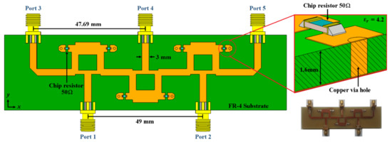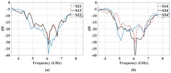 The isolations versus frequency between each input and each output port are shown in Figure 8. The isolation values are greater than 19 dB (greater than 22 dB for the next ports: Input 1-Output 3, Input 2-Output 1, Input 2-Output 3) and the 10-dB bandwidth is greater than 2 GHz.