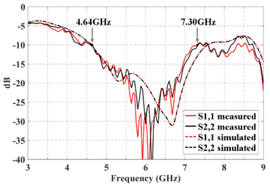 Figure 5 shows the reflection coefficients measured and simulated for the 2 × 3 CORPS network. The bandwidth measured is of 2.66 GHz (values below −10 dB) from 4.64 GHz to 7.30 GHz. It is obtained a value of S1,1 and S2,2 ≈ −28 dB in the design frequency (6 GHz). The lowest value of S1,1 and S2,2 is obtained at 6.12 GHz with a value of ≈−33 dB. The bandwidth obtained by simulation (2.68 GHz) and measurements are very similar with a slight displacement in high frequency of ≈250 MHz. The measured results agree with the electromagnetic simulation results with a certain divergence in high frequencies.