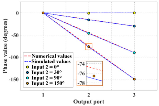Furthermore, two sinusoidal signals were full-wave simulated at the input ports of the network in order to determine the accuracy of the phase values generated by the block of 2 × 3 CORPS network. It was set a phase value of 0 at the input port 1 (as a fixed value), and the phase value at the input port 2 was varied. This generates a phase slope at the three output ports (i.e., an average phase value is delivered at the output port 2, a product of the recombination at the R node of the two signals received at its two input ports). Figure 7 shows the phase values obtained by the full-wave simulation and measurements. This figure illustrates a good agreement between the phase values obtained by simulation and measurements with an adequate recombination of the signal for different phase values at input port 2 (from 0 to 150). The highest value of error is obtained for a phase value of 150 at the input port 2, i.e., an error of 1.2% (0.9) is obtained with respect to the expected phase value (75).