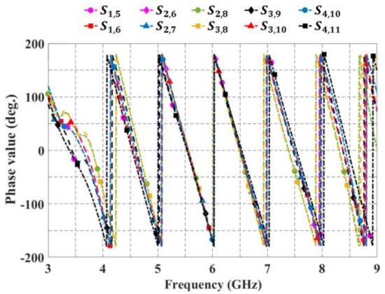 Figure 9 shows the phase response versus frequency of the block of 4 × 7 CORPS. All of these results match well with the design theory to illustrate that the blocks of 2 × 3 and 4 × 7 CORPS networks can be used in the 2-D phased array designs to achieve beamforming network functions.