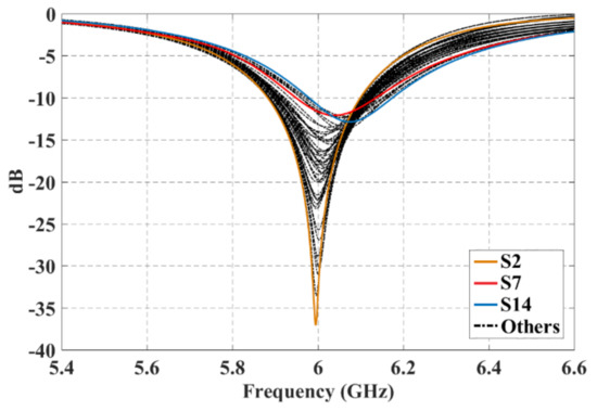 Every scanning direction was examined for all of these three configurations. All of the cases presented a good matching performance and the reflection coefficient was lower than −10 dB in the frequency of interest. The case of worst performance for active reflection coefficients was configuration 1 for the furthest scanning direction. Figure 10 shows the active reflection coefficients for the 49 antenna elements of configuration 1 when the beam is scanned to and . As shown in this figure for the case of worst performance and the farthest direction the active reflection coefficient of 49 antenna elements is remained below −10 dB (for all scanning directions) at 6 GHz.