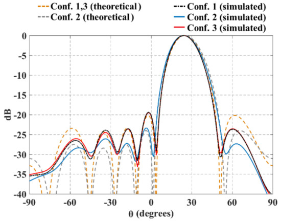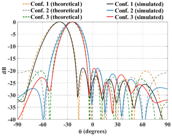 Furthermore, Figure 11 and Figure 12 illustrate the radiation pattern obtained theoretically (without mutual coupling) and by using full-wave simulation (CST Microwave Studio) for the three configurations shown in Figure 1. Figure 11 shows the behavior of the radiation pattern in azimuth for the furthest scanning direction (from the natural response of the array), i.e., (, ) for configuration 1, (, ) for configuration 2 and (, ) for configuration 3. Furthermore, Figure 12 shows the behavior of the radiation pattern in the elevation plane for the furthest scanning direction from broadside ( and ) of the three configurations. As shown in these figures, the full-wave simulation results agree theoretical results. The full-wave simulations obtained by electromagnetic solver present a dB for the configurations 1 and 3, and dB for configuration 2. Configuration 2 presents a lower SLL due to the lower value of a (in the equation 7).