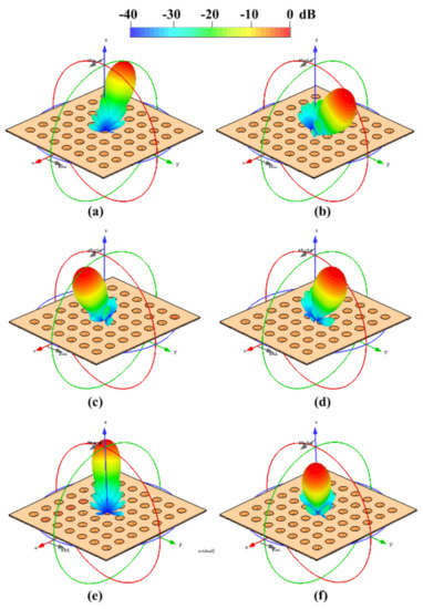 Figure 13 shows the three planar array configurations and the 3D radiation pattern obtained by the CST electromagnetic solver. This figure illustrates the next cases: configuration 1 at and (Figure 13a), and and (Figure 13b); configuration 2 at and (Figure 13c), and and (Figure 13d); configuration 3 at and (Figure 13e), and and (Figure 13f). These results illustrate that the SLL performance is remained below −19 dB for all scanning directions analyzed.