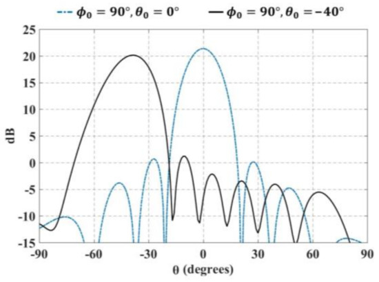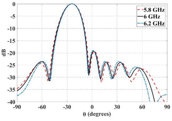 Figure 15 shows the normalized radiation pattern at 5.8 GHz, 6 GHz and 6.2 GHz and for θ0 = −25°. As shown in this figure, the radiation pattern changes very slightly with the changes in the frequency values.