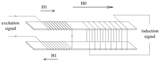 The fluxgate sensor exploits the non-linear relationship between the magnetic induction intensity and magnetic field intensity of a soft magnetic core under an alternating saturated magnetic field excitation to characterize the magnetic field as a voltage in measurements [33,34]. To reduce the interference signal generated by the transformer of the excitation signal, a dual-core fluxgate structure was selected (Figure 1). With this structure, the excitation coils are symmetrical in size and identical in electromagnetic parameter settings. When current is passed through the coils, the magnetic fields generated by them oppose. The magnetic fluxes generated by the excitation current through the common induction coils cancel each other, whereas the fluxes generated by the measured magnetic fields are superimposed on the induction coils.
