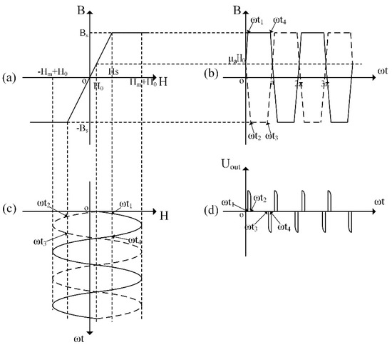 Schematic diagram of the working principle of the dual-core magnetic fluxgate sensor. (a) the simplified hysteresis line of the core (b) the core’s magnetic induction intensity (c) the core’s magnetic field intensity (d) the output voltage of the induction coil.