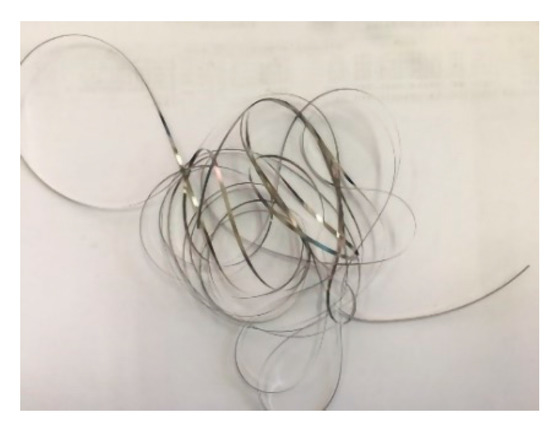 After comparison, the Co-based amorphous ribbon with a width of 1.6 mm (Figure 3) was selected as the core material, thereby improving the probe structure of the fluxgate sensor. The magnetic parameters of CACO-01 are shown in Table 1 below. Compared with the classic Metglas 2714A Co-based amorphous ribbon, it has a lower saturation magnetic field intensity and lower coercivity, making it more suitable for compact fluxgate probes.
