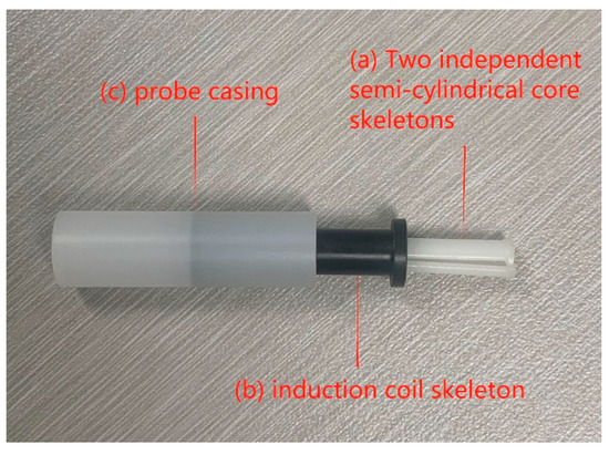 Photo of the probe structure. (a) Two independent semi-cylindrical core skeletons; (b) induction coil skeleton; (c) probe casing.