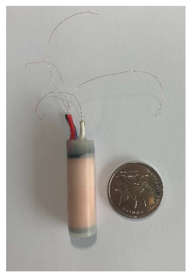 Two independent semi-cylindrical core skeletons (Figure 4-a) enable the manufacturer to use a machine to wind the excitation coils, thereby significantly reducing labor costs. After winding is completed, the two skeletons are combined and fixed. A gap of 1.8 mm is left in the middle of the core skeletons that allows for the insertion of the Co-based amorphous ribbon. Amorphous alloy magnetic tapes reach periodic deep saturation as the high frequency excitation field changes. A multi-core design is adopted for the probe. This reduces considerably the required core cross-sectional area and excitation current compared with that using the traditional permalloy material, while maintaining the same probe sensitivity, thereby reducing the size and power consumption of the sensor. The induction coils (Figure 4-b) are also machine-wound. After winding, the core skeleton is inserted into the central cavity of the induction coil skeleton and encapsulated together into the externally protected probe casing (Figure 4-c). Compared with the size of the common ring-type probe of fluxgate sensors deployed in geomagnetic field stations, the size of the modified probe (Figure 5) is greatly reduced. The single-component probe is only Φ10 mm × 30 mm in size.