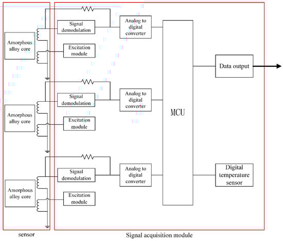 A fluxgate sensor is a vector sensor that can be used to measure constant magnetic fields or low-frequency magnetic fields [1,2]. The sensor is based on the phenomenon of electromagnetic induction and modulates the measured magnetic field by the transformer effect. Compared with other types of magnetic sensors, fluxgate sensors have advantages such as high resolution (up to 0.1 nT), wide magnetic field measurement range and good stability [3,4,5,6,7].