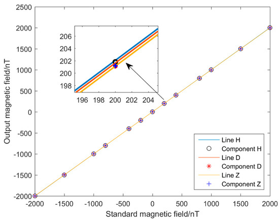 The current in the test coil of the magnetic shielding cylinder was varied to generate standard magnetic fields of different strengths. The output values of the fluxgate magnetometer were recorded for the different magnetic field strengths (see Table 2). The test results (Figure 10) show that the linearity of our fluxgate sensor was better than 4‰ along all three axes; with this excellent linearity, a good performance similar to the traditional fluxgate sensor was attained.
