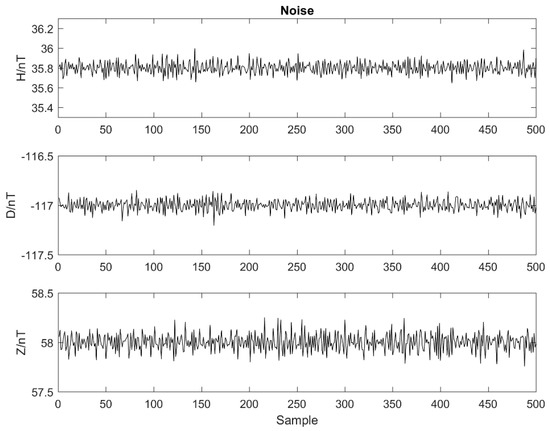 For noise tests, there was no applied magnetic field in any direction inside the shielded cylinder. The output values of the three components of the fluxgate sensor were recorded over a set period of time. Five hundred continuous samples of data were selected after readings were stabilized (Figure 11). The RMS values of noise, , where N denotes the number of samples, the sampled value and the average of the sampled values, were calculated and are here listed in Table 3. The maximum value among the three components of noise is 0.087 nT, that is, the designed fluxgate sensor has an RMS noise value below 0.1 nT. Compared with the noise level of traditional fluxgate devices used at geomagnetic field stations, such as the GM4 fluxgate magnetometer used by the Chinese geomagnetic network, the noise level of our sensor is comparable and meets the needs for geomagnetic field observations. Compared with a micro-fluxgate sensor, our sensor has significantly less noise.