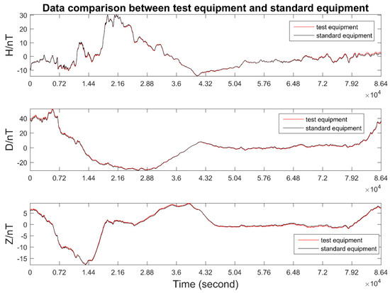 The performance of the fluxgate sensor was further examined from a correlation analysis of the daily geomagnetic field variation recorded by the standard instrument and designed instrument. After a period of observations, the data for the three components of the geomagnetic field measured by the two instruments in the same working environment were in good agreement. The data taken over one day of recordings were plotted for a visual comparison (Figure 13).