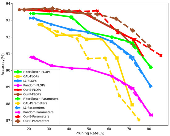With the development of deep neural networks in recent years, great success has been achieved in computer vision applications [,,,]. However, their apparent effectiveness is based on increasing storage, memory footprint, computational resources, and energy consumption, making most advanced Convolutional Neural Networks (CNNs) impossible to be deployed on edge devices such as cell phones and light devices. Although there are deep neural network acceleration frameworks such as TensorRT, they cannot reduce the network model. Therefore, there is still an important demand to reduce the parameters and floating point operations (FLOPs) of CNNs while keeping the accuracy unchanged. Common techniques include quantization [,,,], knowledge distillation [,,], and network pruning [,,,,]. In earlier work, pruning approaches [,] mainly used unstructured methods to obtain filters for irregular sparsity. To facilitate the deployment of models on general-purpose hardware and/or the use of basic linear algebra subroutine (BLAS) libraries, recent works have focused more on structured pruning or filter pruning [,,], which simultaneously pursues the reduction of model size and improvement of computational efficiency.