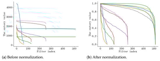 Softmax. To analyze the conventional softmax and the improved softmax, we conducted an analytical comparison. From Figure 8 we can see that the improved softmax facilitates a more decentralized distribution of entropy values compared to the conventional softmax, which is easier to achieve when evaluating the filter importance. In Figure 9, we visualize the feature maps after the two softmax methods, and we can see that Figure 9b can suppress the background and highlight the role of feature information than Figure 9a, which is beneficial to the subsequent entropy calculation. In Table 5, the implementation analysis on multiple networks further confirms that the improved softmax is more conducive to the pruning effect. For example, VGG16 achieves an accuracy of 93.53% using the improved softmax, while the conventional softmax causes a serious decrease in model accuracy. The analysis found that the conventional pruning would prune the deep convolution of the network more strongly, making the FLOPs much less, but the accuracy would be seriously affected. So we decided to use the improved softmax as the final choice.