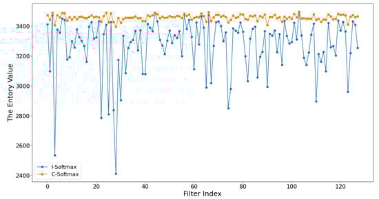 Entropy results of the feature map after the fourth layer of convolution of VGG16. The conventional softmax (C-Softmax) and the improved softmax (I-Softmax) produce different entropy distributions.