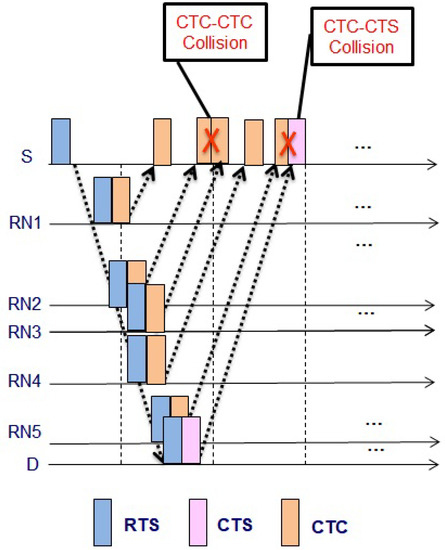 When the CTC collision from different RNs at S occurs, S becomes deprived of potential relying. Since the propagation delay is very long in the UWA channel, the collision is crucial. Even if the small parts of the packets are overlapped at S, the collision happens. Two types of collisions at S can occur, i.e., CTC-CTC and CTC-CTS collisions. CTC-CTC collision at S is caused by RNs whose distances to S are similar. In Figure 2, RN4 and RN3 have a similar distance to S, and when RN4 and RN3 reply CTC to S, the CTC-CTC collision occurs. To avoid CTC-CTC collision, RNs must send the packet with a back-off time, which is calculated from the channel gain, e.g., the RSSI of the received RTS. The back-off time can be calculated as below