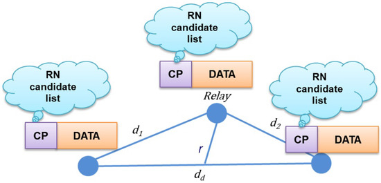 In Equation (5), is the total number of RNs taking part in the process of cooperation. Each RN checks its compatibility by using Equations (3)–(5). The compatible RNs minimize the collision of control packets. The eligible and compatible RNs reply with a control packet, i.e., clear to cooperate (CTC). Additional information, i.e, propagation delay from RN-D is attached with CTC before transmitting to S. Note that if D is ready to accept the data packet from S, D responds with CTS.