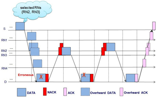 If D does not successfully decode the information of the received data transmitted from the S, D sends NACK, which is received not only by S but also by RNs. The first priority RN listened to NACK from D and transmits the buffered data packet to D. When the D receives and successfully decode the data packet, it broadcasts ACK. After receiving an ACK, RN in candidates list discards data packet, and all RNs and S goes to the sleep mode. If D fails to decode again, it replies with a NACK and the second priority RN retransmits the data packet to D. Thus, D receives the data packet transmitted a second time by the second priority RN. S waits until the whole process of retransmissions from the RN is completed. In Equation (8), total waiting time () at S is formulated as