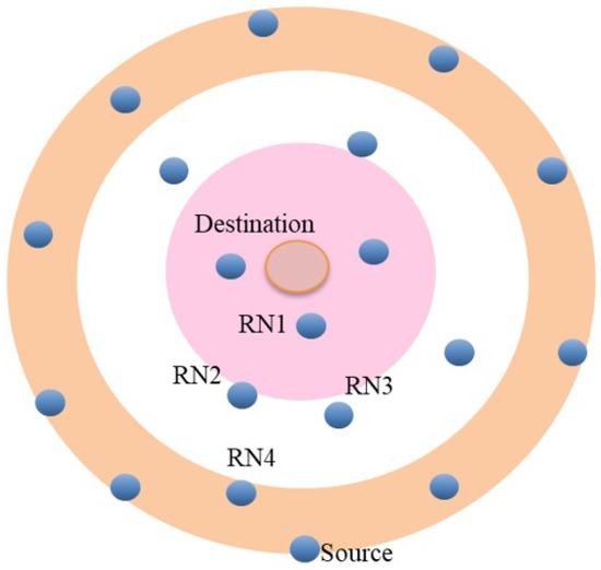 - The list of selected RNs is created by summing the two link propagation delays (S-RN and RN-D). RNs are arranged in an order that the top most RN has the minimum distance to the midpoint of direct link (S-D). The arranged list of selected RNs is attached along with data packet.