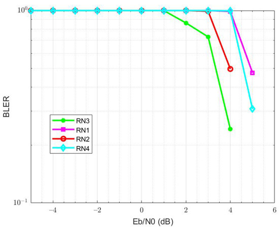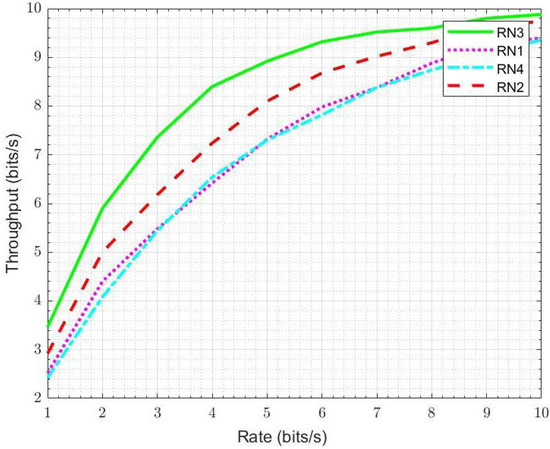 We compare the throughput of four RNs, located between S and D, and calculate the throughput of RNs by adding the quality of two links, i.e., S-RN and RN-D. In the proposed EBRN, RN3 belongs to the list of cooperating RNs that showed the maximum throughput among the four RNs shown in Figure 7. From the figure, it can be seen that at the rate of 5 bits/s, RN1 and RN4 throughput is around 7.2 bits/s, RN2 throughput is 8 bits/s, RN3 throughput is around 8.9 bits/s. In Figure 8, we can see that the nearest RN to D is RN1 and RN4 is closest to S. RN1 and RN4 need more power to reduce errors. We calculate BLER by considering two links, i.e., and . For RN1, S-RN1 is very long, which causes more error in a received signal and require more SNR to overcome the errors. Similar is the case with R4, whose link R-D has many errors. RN3 and RN2 show good performance but RN3 that lies nearer to mid-point of direct link has minimum BLER.