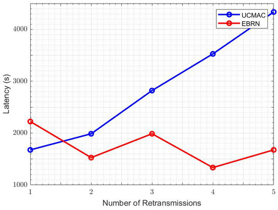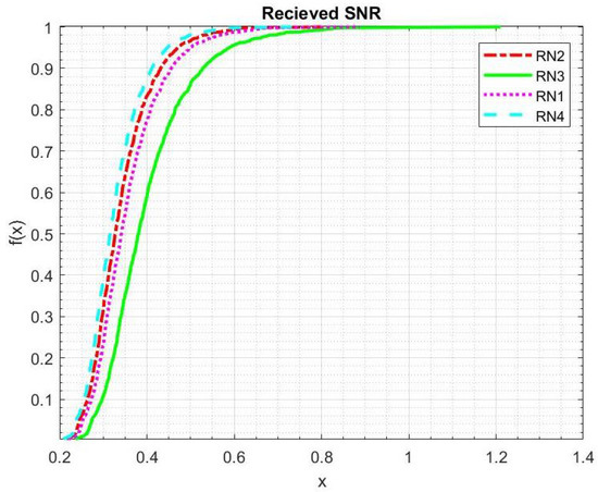 Figure 9 shows the overall SNR of the channels related to four RNs. Here, both links, S to RN and RN to D, have been considered. It shows that the SNR of RN3 (top priority in the candidate list) in EBRN has better SNR performance than other RNs. Figure 10 demonstrates that the latency of UCMAC increases with retransmissions, while in EBRN, mostly selected RNs locates around mid-point, so latency is consistent. Latency in the underwater environment is strongly affected by the number of retransmissions. Due to the long propagation delay problem in the underwater channel, the author in [28] assumed that RN nearest to the D is best for the retransmission procedure. The RN that is nearest to D is furthest from the S. In this case, S to RN link is almost similar to S to D link. The procedure follows as D asks the nearest one for retransmission, and if the nearest one RN also has an erroneous data packet, D will ask to the second closest and so on. If data received at RNs is erroneous, NACK transmission for that RN is just a waste of time and energy. In EBRN, the RN is nearest to the midpoint between S and D direct link. In this way, S to RN and RN to D has almost similar propagation delay. RN will have more chances to have error-free data packets in both connections. The path between S and selected RN is small, relative to the RN that lies nearest to D. So it is ensured that the data received at chosen RN is error-free, and D has to receive the data packet from RNs by sending control packets. There is a high possibility to have a one-time transmission of NACK in EBRN than in UCMAC. Overall performance of EBRN outperforms the UCMAC and SPF hence proving that this scheme is a well-coordinated cooperation scheme.
