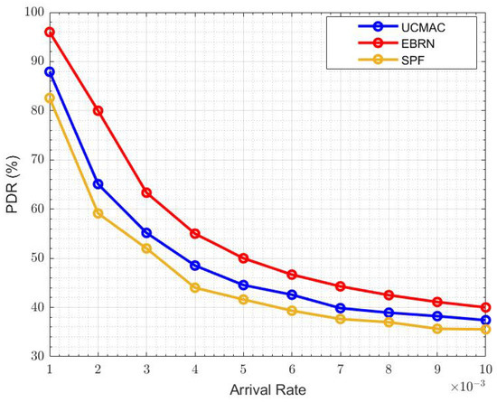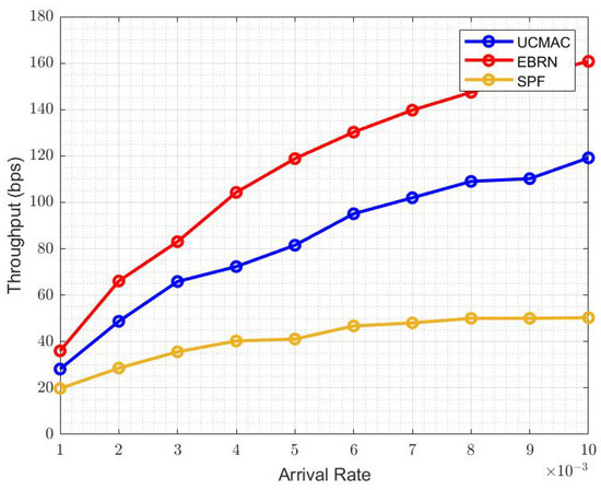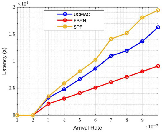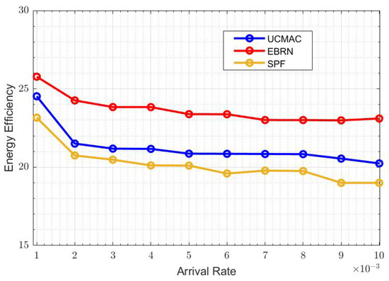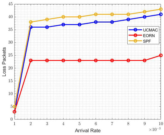 Figure 13 sows the overall energy efficiency represents. The energy consumed when the data packet is generated and transmitted at the sensor node. If there are more erroneous data packets, there will be more energy consumption. When the arrival rate is , EBRN is more energy-efficient, and its efficiency is around 24, while in UCMAC, and SPF efficiency becomes lower, i.e., 21 and 19, respectively. In Figure 14, we can see the fewer packets are lost in EBRN than in UCMAC and SPF as in EBRN error-free data receives at one retransmission. At the arrival rate of , the LR for UCMAC and SPF is around 36 and 40 packets, while in EBRN, it’s almost 24 packets. In EBRN, Collision among data packets is reduced by considering the control packet collision avoidance methods mentioned in Section 3. In EBRN, the lost data packet decreases because of the one-time retransmission at a given time. It also increases the packet delivery ratio accordingly, seen in Figure 15. At the arrival rate of , the PDR for UCMAC and SPF is around 38% and 42%, respectively. Whereas, in EBRN, PDR is almost 50%. In all the given results, EBRN outperforms UCMAC and SPF.