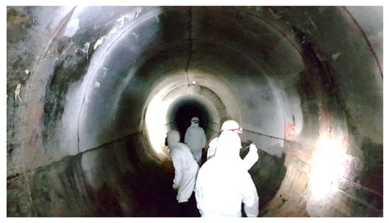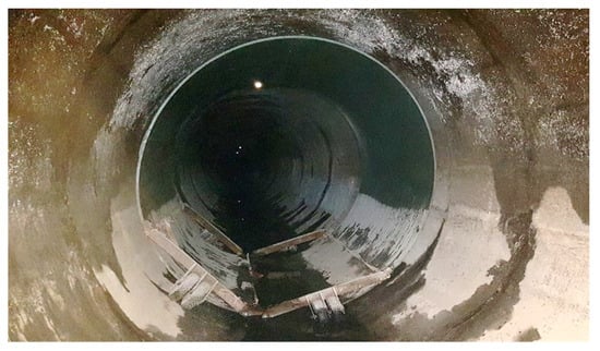 In 2019, a decision was made to retrofit a 4.8 km long section of the collector using non-circular GRP modules and relining technology []. The interior of the collector was lined with 1600 modules of polyester resin panels, each 3 m long (Figure 2). The space between the panels placed inside and the existing inner walls of the collector was filled with a cement grout.