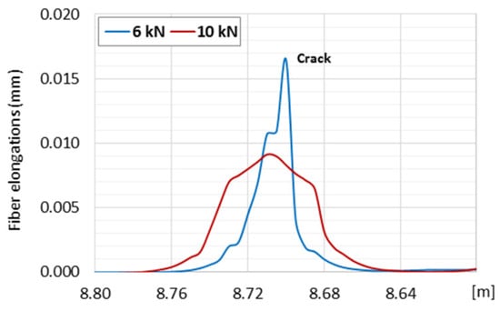 Layered design of sensing cables allows these layers to slip uncontrolled in relation to each other; thus, it is not possible to unambiguously transfer strain to the internal measuring fiber in the desired strain range. An intuitive example showing the influence of layer slippage effect on the final strain results is presented in Figure 4 []. In the present example the telecom fiber SM9/125 in tight jacket was used (it was embedded into concrete beam). The layered structure of the cross section caused local slippages which disturb strain transfer in the vicinity of the cracks. The local strain peak corresponding to crack was decreased while increasing the force. Such an effect is not acceptable for reliable and accurate data analysis. Slippage was observed even when analyzing small cracks less than 0.05 mm (Figure 4) []. The wider the cracks, the more probable the slippage effect is. Such slippage can also occur between the sensing cable with smooth external surface and the surrounded material, such as concrete.