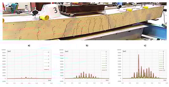 Crack analysis in reinforced concrete beam using monolithic DFOS sensors. Sensor was embedded inside the beam at the height of main bottom reinforcement (courtesy by []). Graphs show strains development during increasing the load (local peaks correspond to cracks near to the bottom surface); (a) initial phase; (b) middle phase; (c) final phase.
