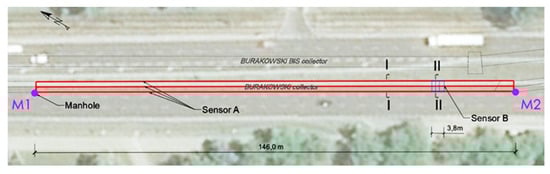 The monitoring covered the renovated segment of the Burakowski sewage collector, specifically the section where the structural damage was most significant. The length of the pilot section equipped with sensors was about 146 m (Figure 7). The sensors were brought to the ground surface through two inspection chambers M1 and M2 (Figure 7) located in the road lane at opposite ends of the installation to allow placement of the measuring equipment outside the collector.