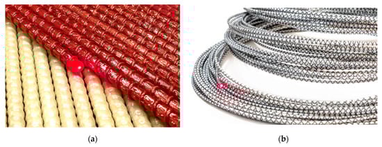 Two types of sensors were installed in the monitored section—see Figure 8. The first one (type A—EpsilonRebar) is constructed from glass-fiber core with a measuring range of ±2%. The second one (Sensor B—EpsilonSensor) is based on a polyester fiber core with a measuring range of ±4%. The optical fiber is fully integrated with the sensors’ core during their production process (pultrusion).